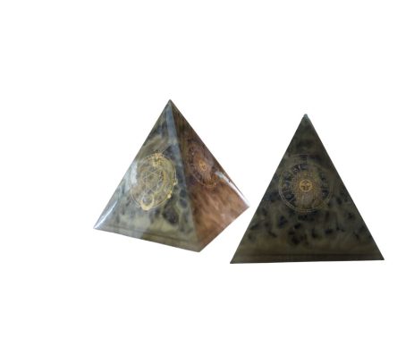 Orgone pyramid – 1146g, L=13 cm Epoxy resin, metal powder, micca powder , shungite and hematite, copper spirals, metal scraps Unique handmade product. To order can be made similar, not identical Free delivery in EU.