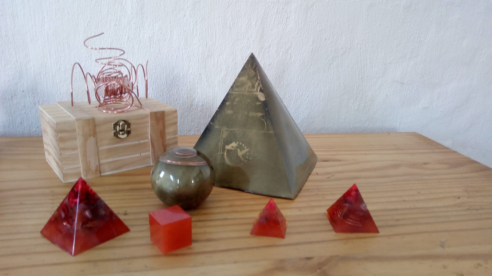Epoxy resin, metal powder, shungite and hematite, copper spirals, metal scraps