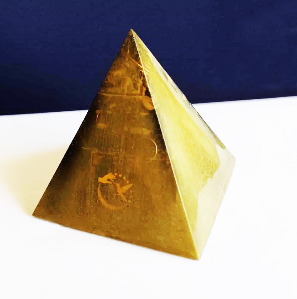 Orgone pyramid – 1257g, L=14 cm Epoxy resin, metal powder, shungite and hematite, copper spirals, metal scraps Unique handmade product. To order can be made similar, not identical Free delivery in EU.
